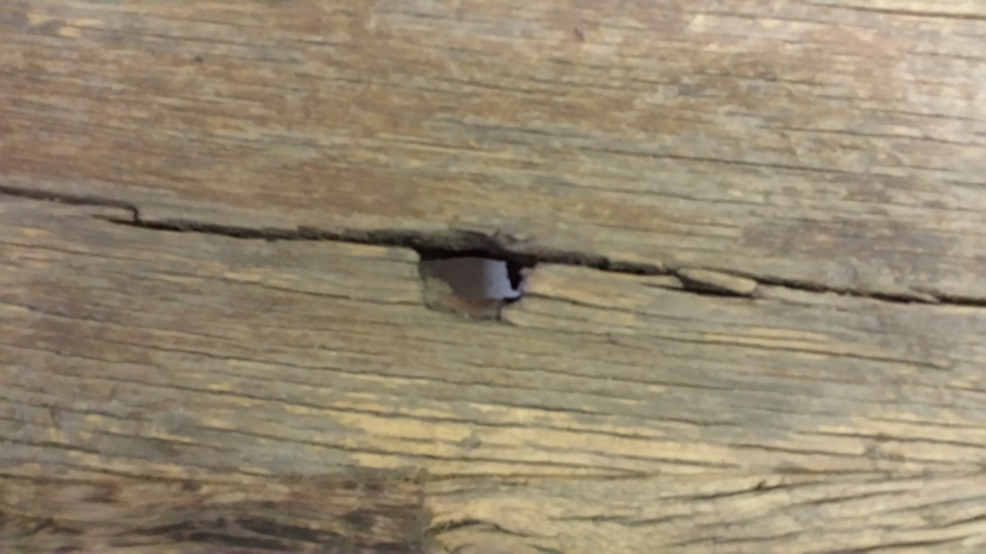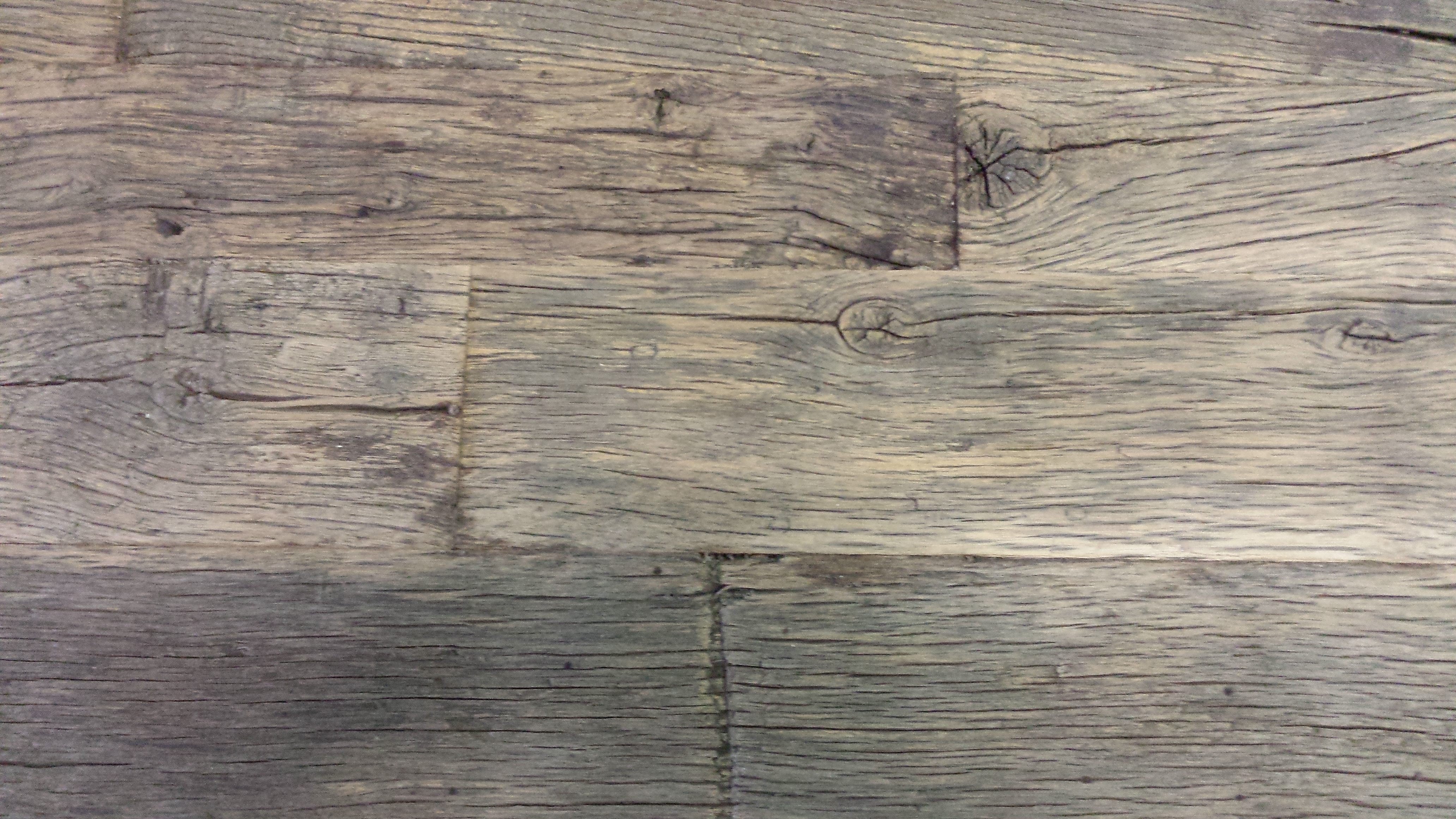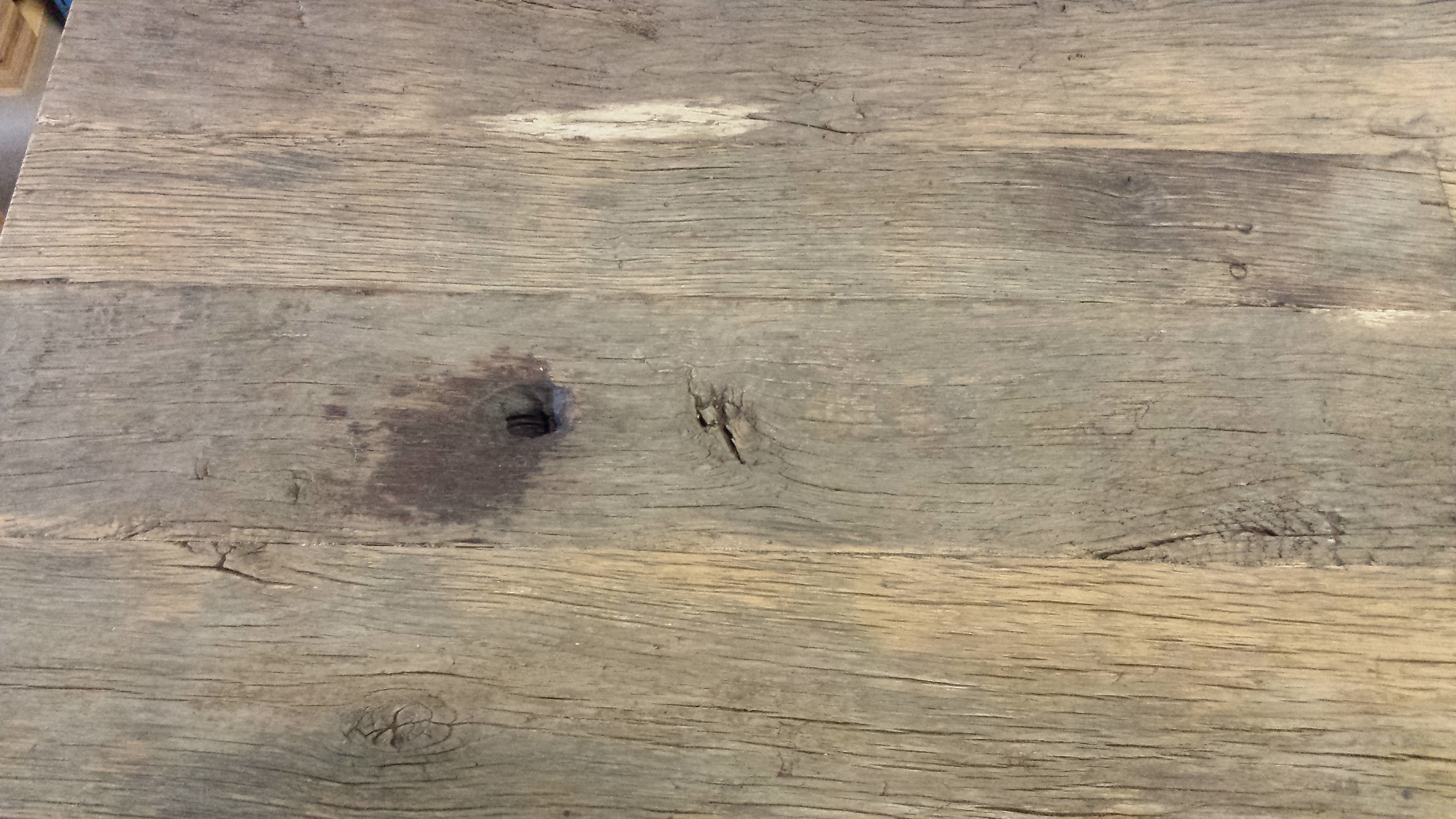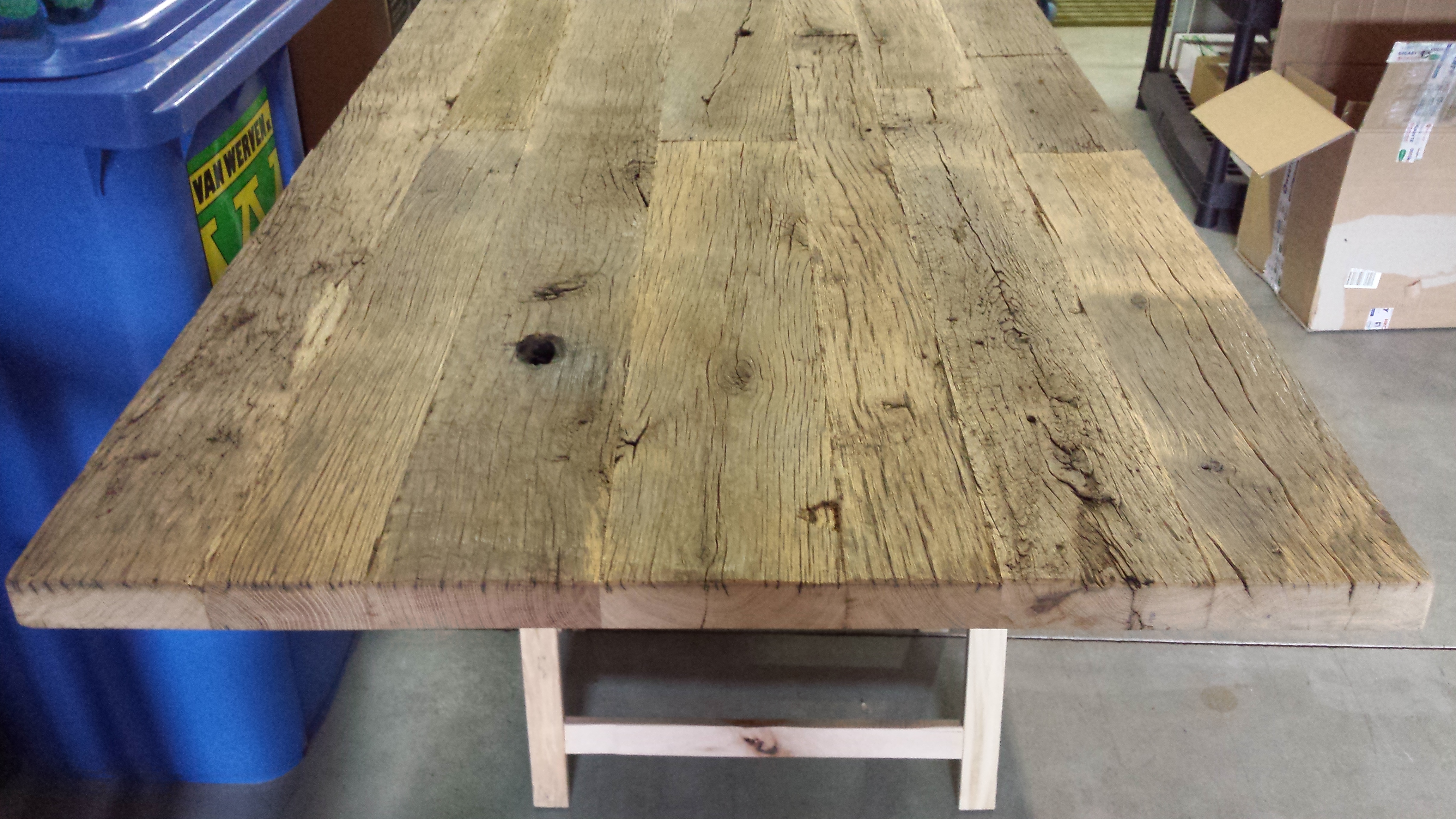 Tafelblad gemaakt van stroken hout van oude eiken wagonplanken. Dit is een verlengd blad, dwz dat van korte stroken lange planken van 300 cm zijn gemaakt en deze planken zijn verlijmd tot een blad van ca 90 cm breed.