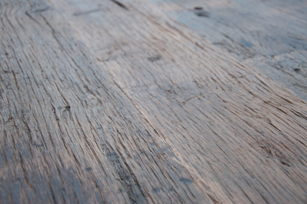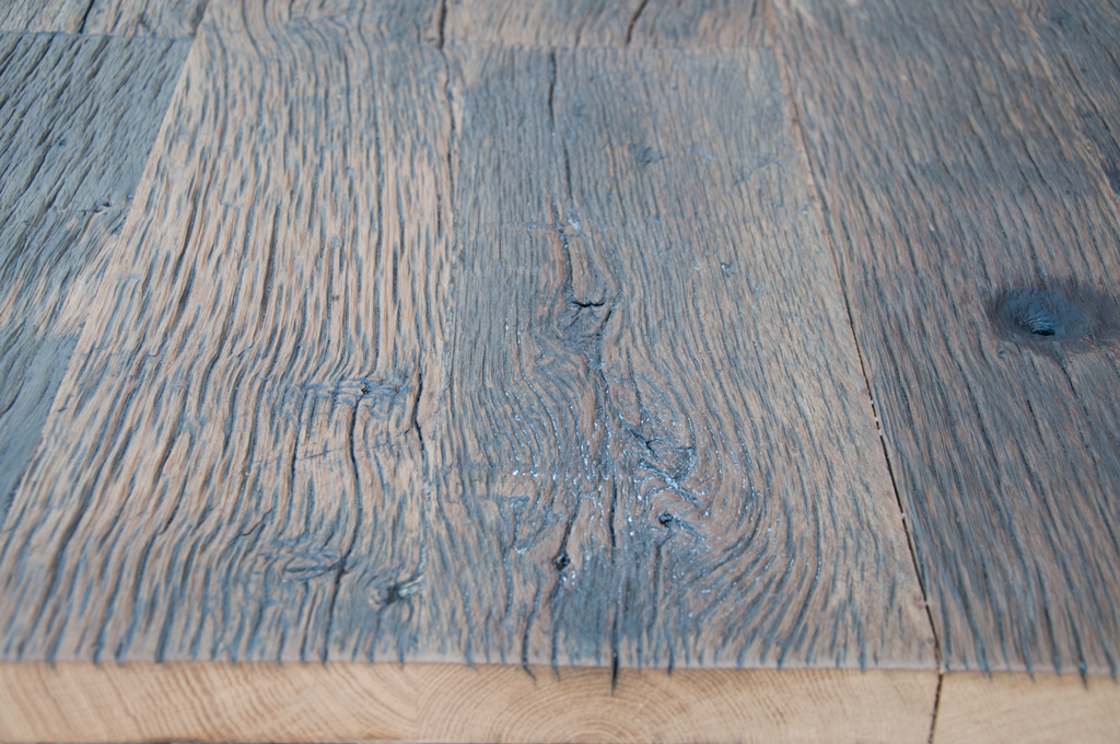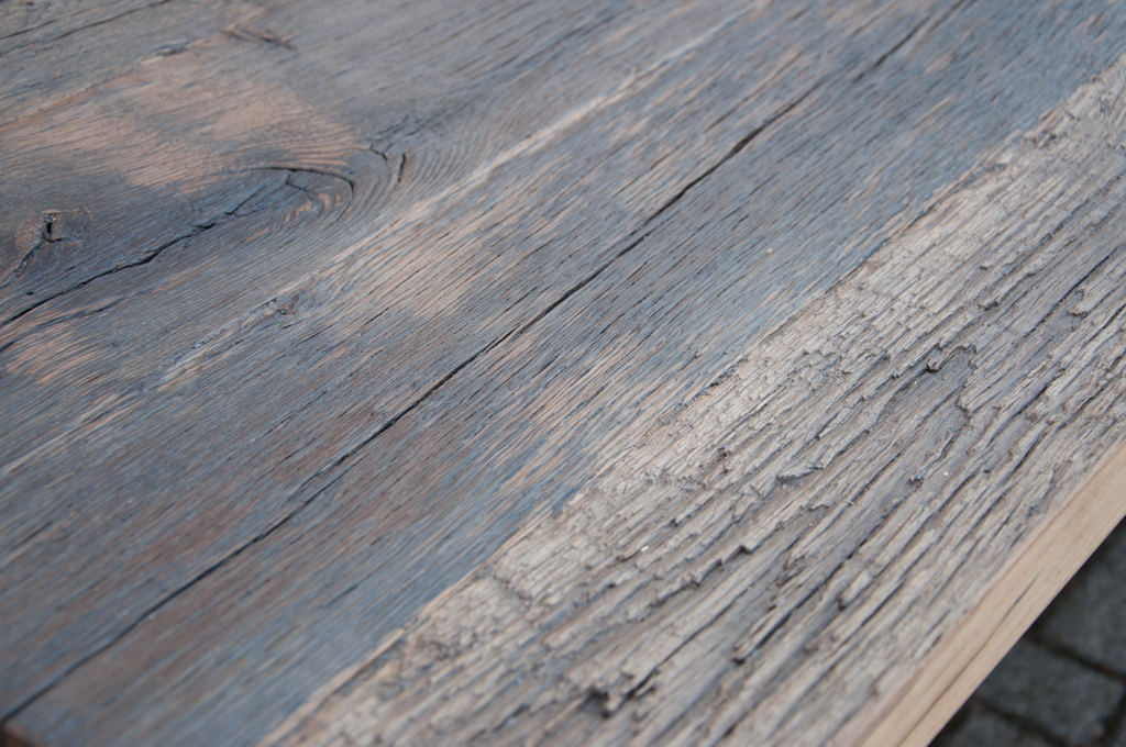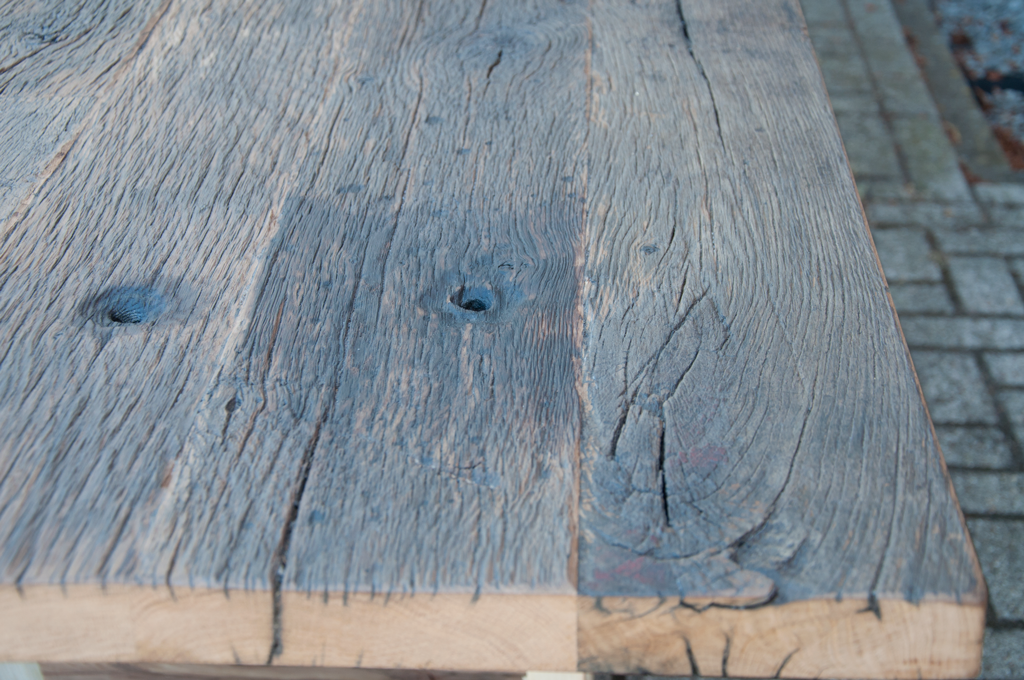 Dit verlengde blad bestaat uit geborstelde en zeer licht geschuurde wagonplanken. Het blad was na productie nog erg mooi ruw en kon daardoor scherp aanvoelen en je liep het risico om een splinter in je vel te krijgen. We hebben dit tafelblad daarom al meteen een behandeling met Skylt laten geven zodat de splinters goed in matte lak ingekapseld zijn. Het blad is nog steeds heel ruw maar splintert niet meer. Daarmee is het geschikt als tafelblad in de woonkamer of als vergadertafel.
