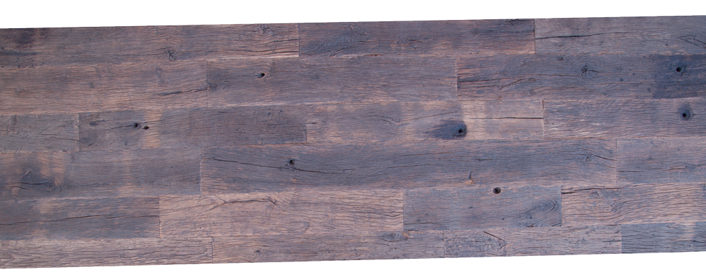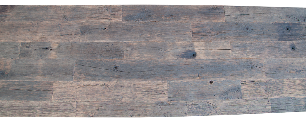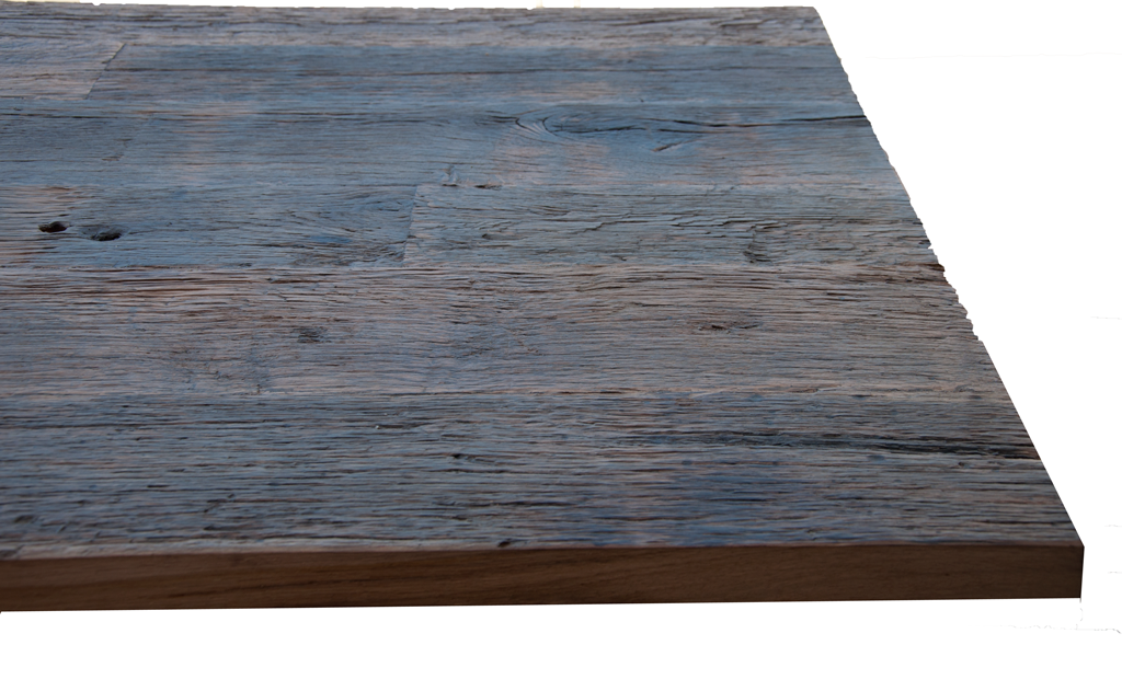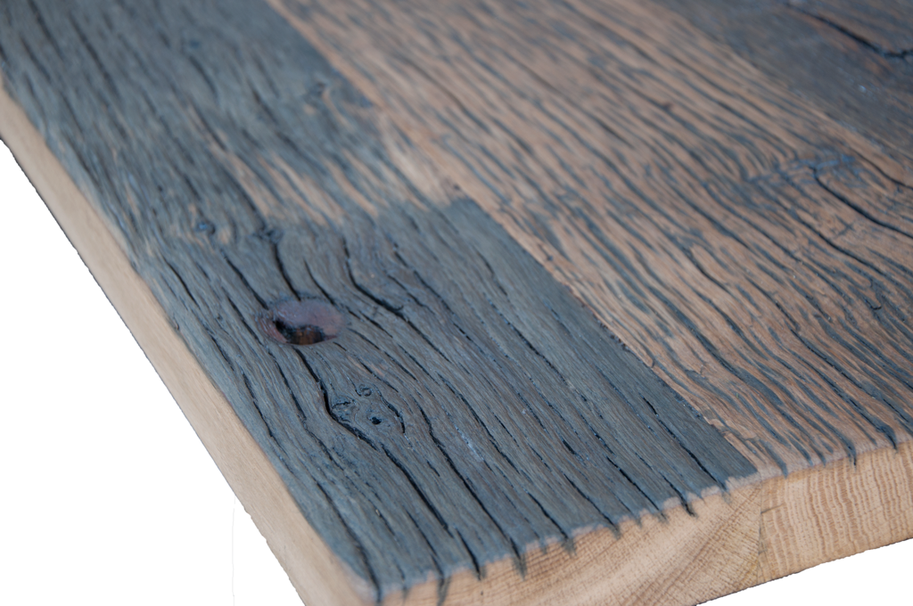 Een uniek tafelblad met een geweldige uitstraling. Dit tafelblad is gemaakt van eiken wagonplanken. De meeste wagons hebben een vloer van 270cm breed. De planken liggen in de breedte van een wagon en hebben een lengte van 270cm. Vaak zijn de uiteinden van zo’n wagonplank versleten en moeten de meubelmakers de planken inkorten. Zo blijven er korte stukken over. Hiermee wordt een compositie van plankdelen gemaakt. Als de meubelmakers tevreden zijn over de compositie, dan worden de delen definitief aan elkaar gelijmd tot een tafelblad. Zo’n blad wordt een verlengd blad genoemd, de korte plankdelen zijn verlengd tot lange planken. Met deze techniek is bijna iedere denkbare lengte te maken.