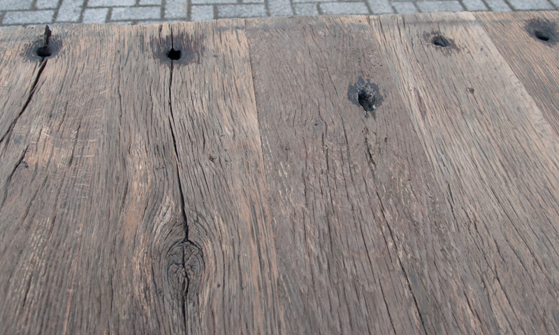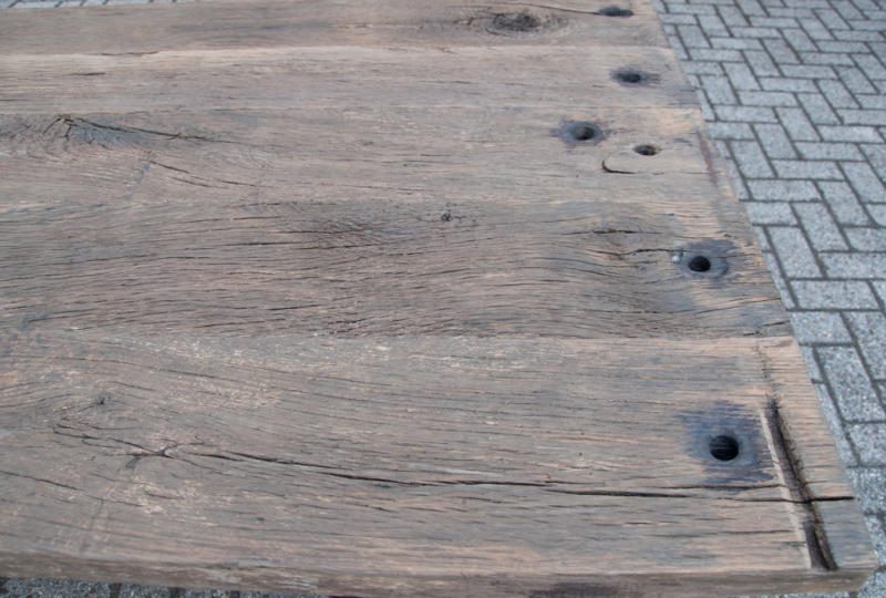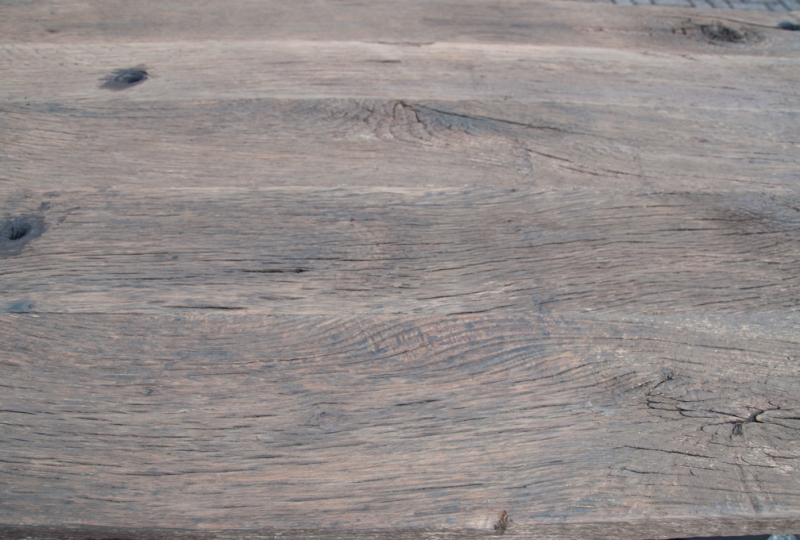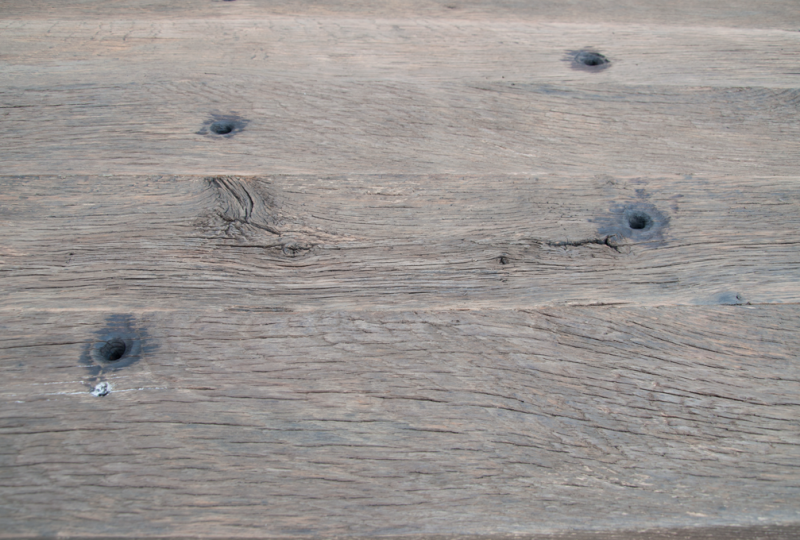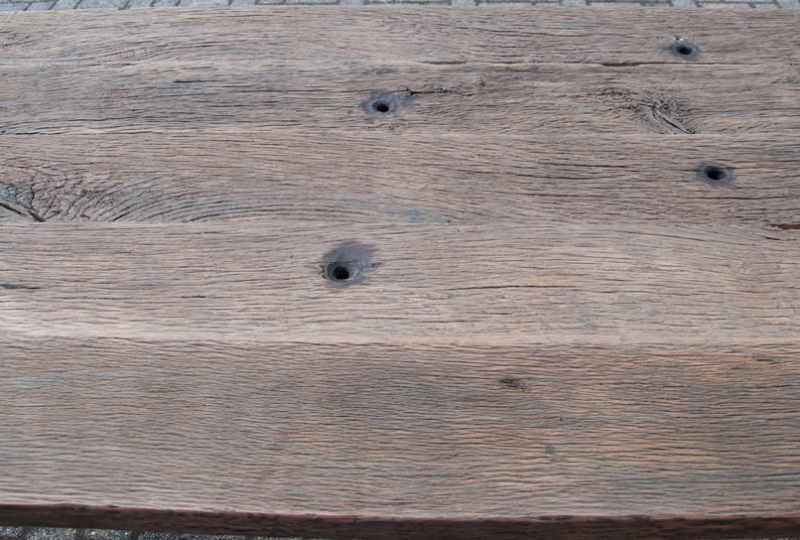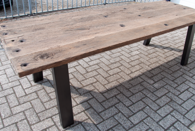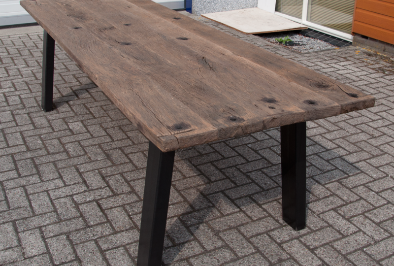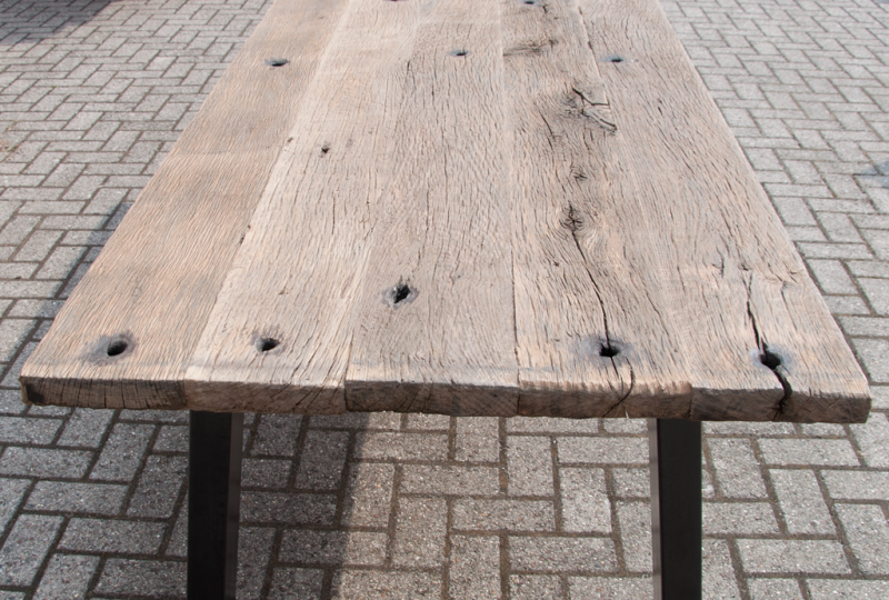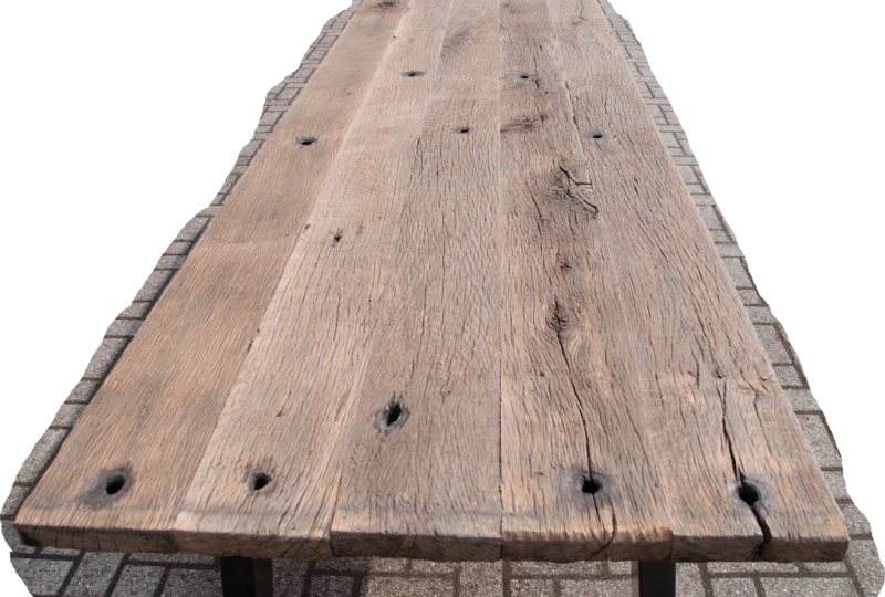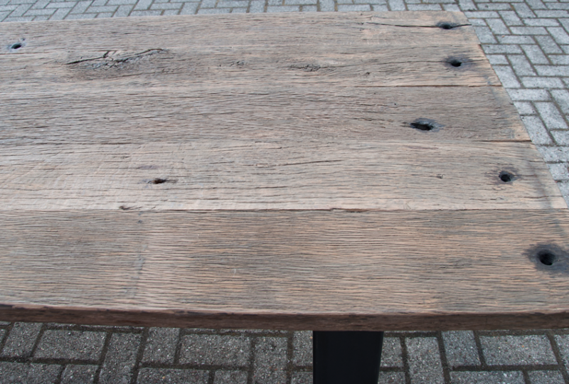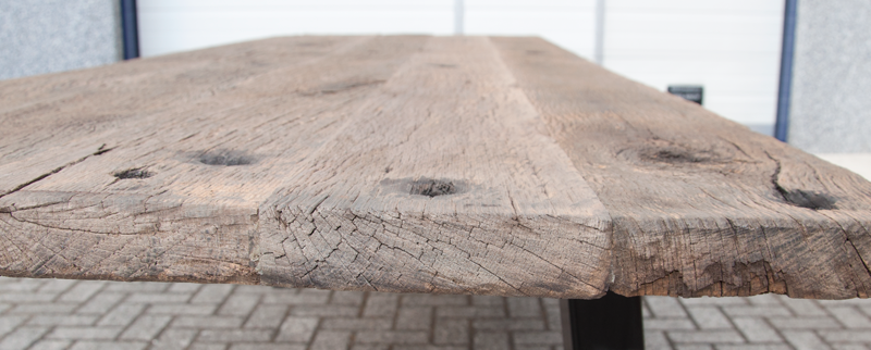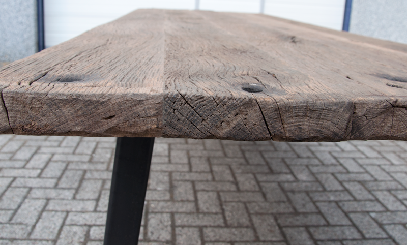 De planken hebben hun eigen ruwe kopse kanten nog. En dat is bijzonder want bijna altijd worden de kopse kanten afgezaagd omdat ze te slecht zijn om nog te kunnen gebruiken. Bij dit blad is dat niet zo. De hele lengte van de planken is gebruikt. Hierdoor is de lengte van het blad circa 272 cm lang… Dit geeft een extra stoere uitstraling aan dit blad.